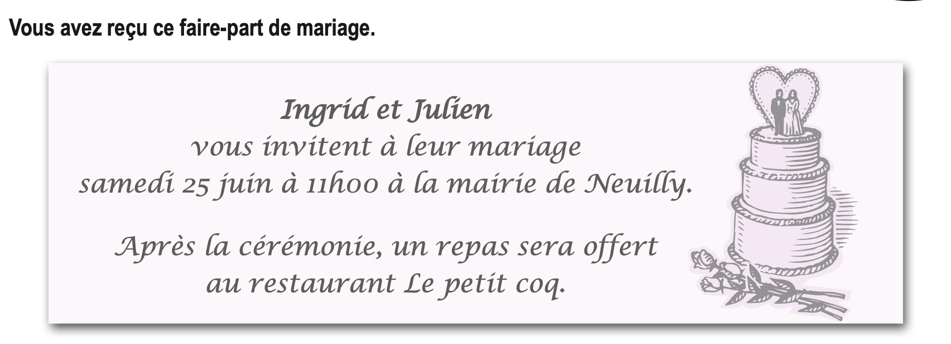Vous envoyez un courriel à vos amis pour les féliciter de leur mariage. Vous acceptez leur invitation et