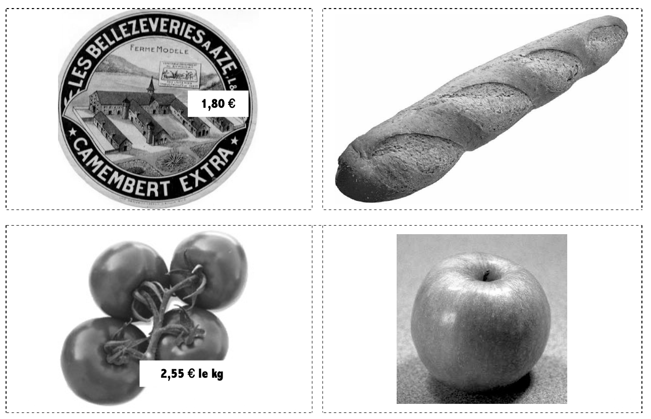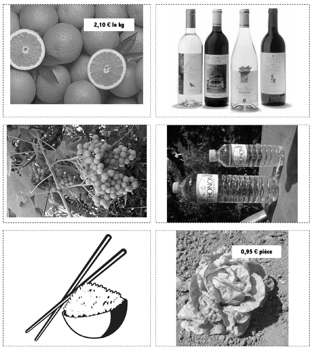Vous êtes le client et vous voulez plusieurs produits (images). Posez des questions sur la quantité, la qualité, le prix et d'autres choses que vous voulez savoir. Vous dites comment vous payez.